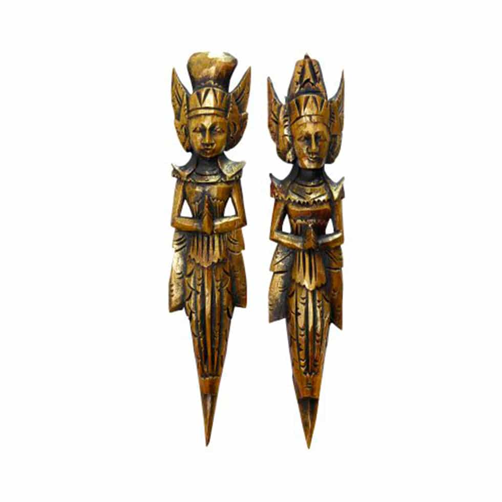 Pareja figuras balinesas orientales realizadas a mano por artesanos con madera pintada en color dorado y esculpida. Se pueden colgar mediante la pequeña cuerda que tienen atrás.
